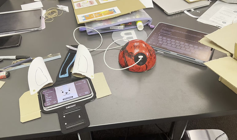A Wizard of Oz Route was used to test our prototype. The app's interface had mechanical ears made out of cardboard & card & were manually moved during the session, while the logic behind the app was coded on a PC & screenshared onto a phone to mimic: